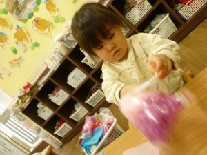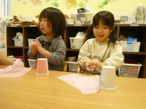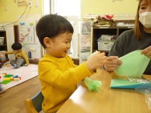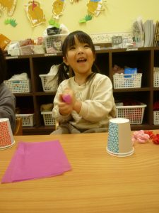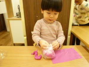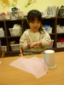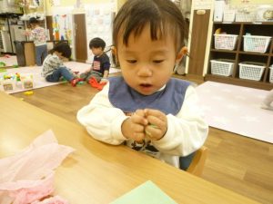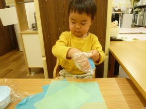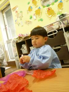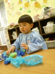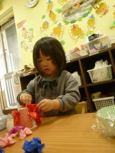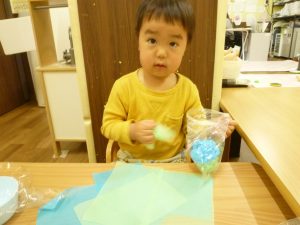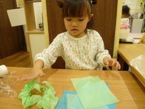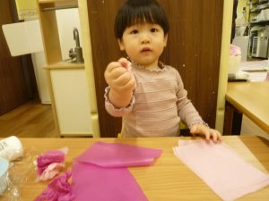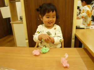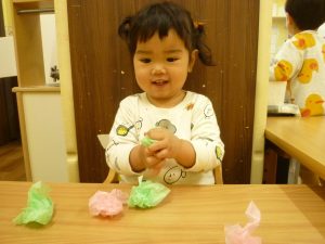 くちゃくちゃにしたお花紙が手から離れなくなっちゃったよ~~