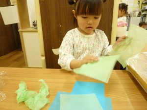 くちゃくちゃにしたお花紙が手から離れなくなっちゃったよ~~